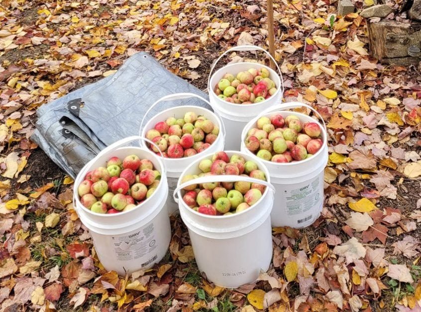 Passing the old apple tree around the corner, we saw it was loaded with heavy fruit. Within two hours we had set up a tarp, shook the apples into it, and filled 5 buckets with fruit to be preserved.